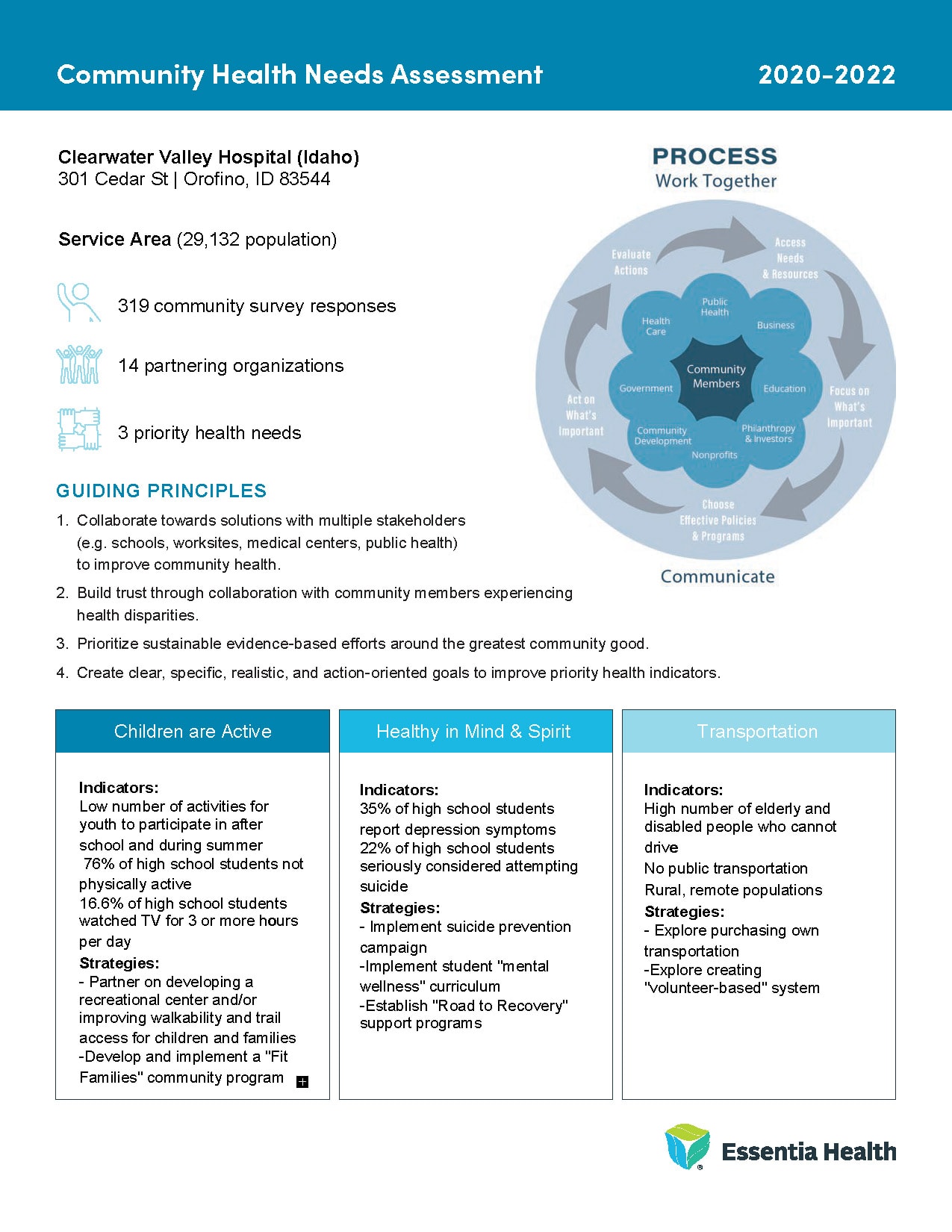 In collaboration with our community partners, we conducted Community Health Needs Assessments (CHNA). CHNA’s are part strategic plan and part grounding rod. The Patient Protection and Affordable Care Act of 2010 (ACA) requires tax-exempt hospitals to create a hospital community health needs assessment every three years.