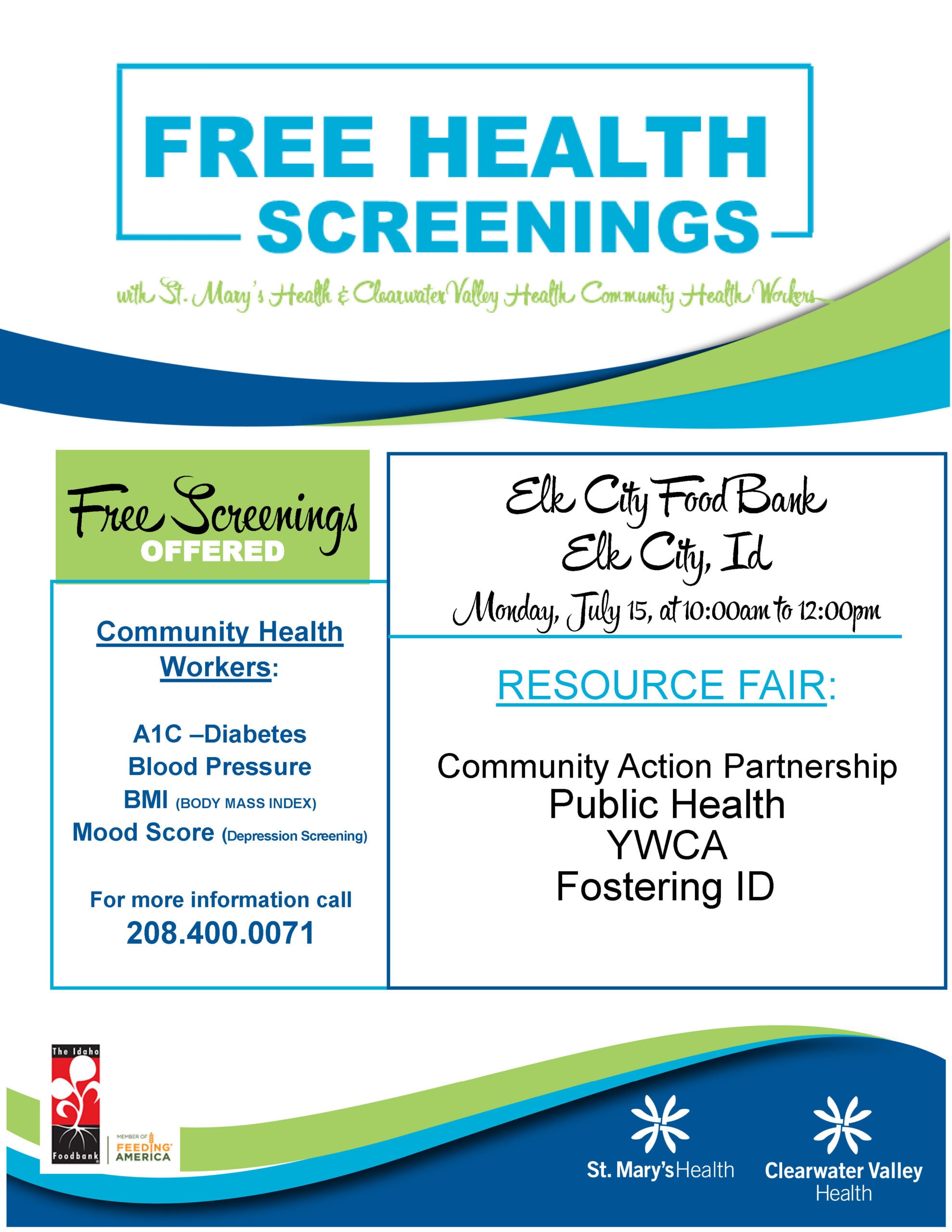 Free Health Screening at the Elk City Food Bank in Elk City Idaho! Screenings Offered:A1C-DiabetesBlood PressureBMIFIT TestMood Score under 18 must have a parent consent.