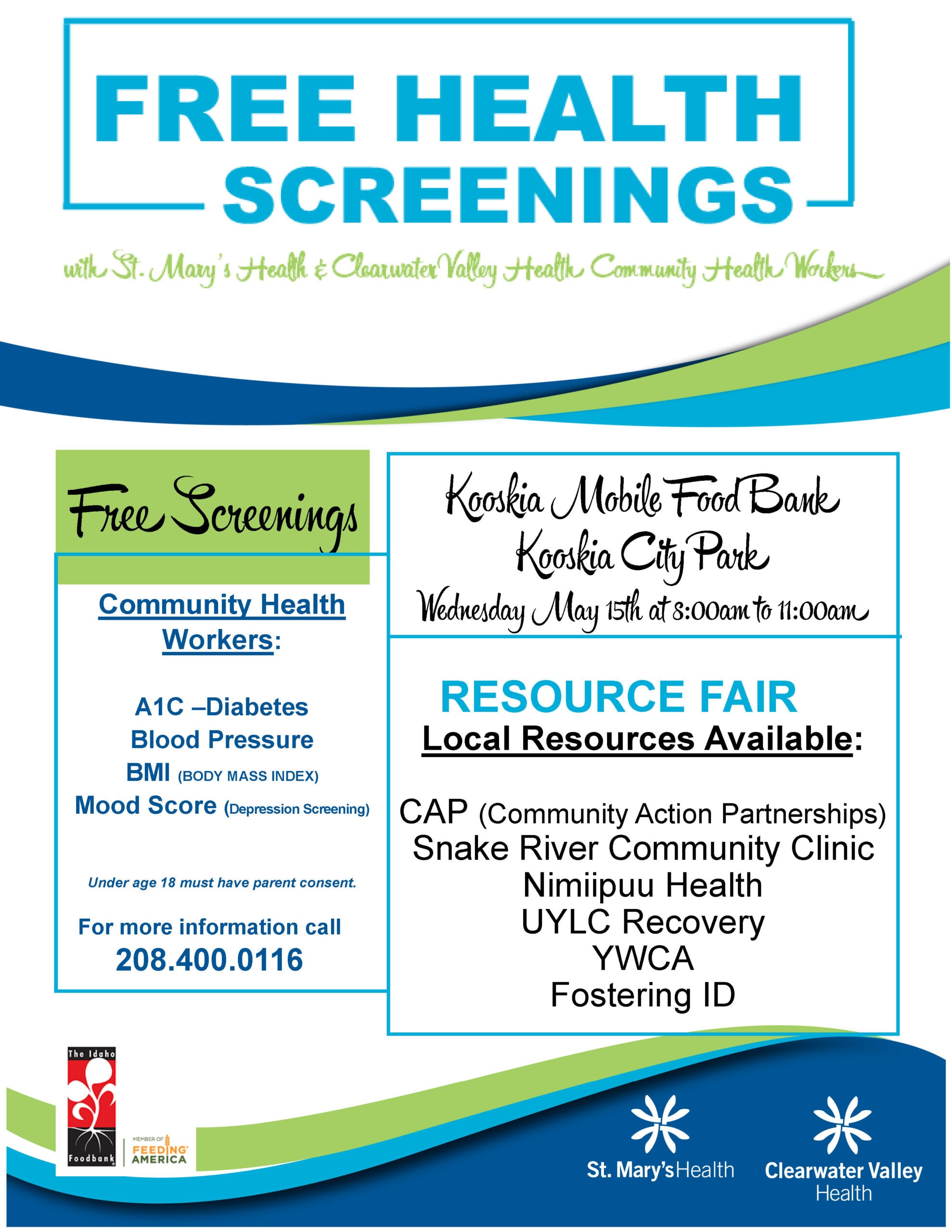 Free Health Screening at the Camas Prairie Food Bank in Grangeville Idaho! Screenings Offered:A1C-DiabetesBlood PressureBMIFIT TestMood Score under 18 must have a parent consent.