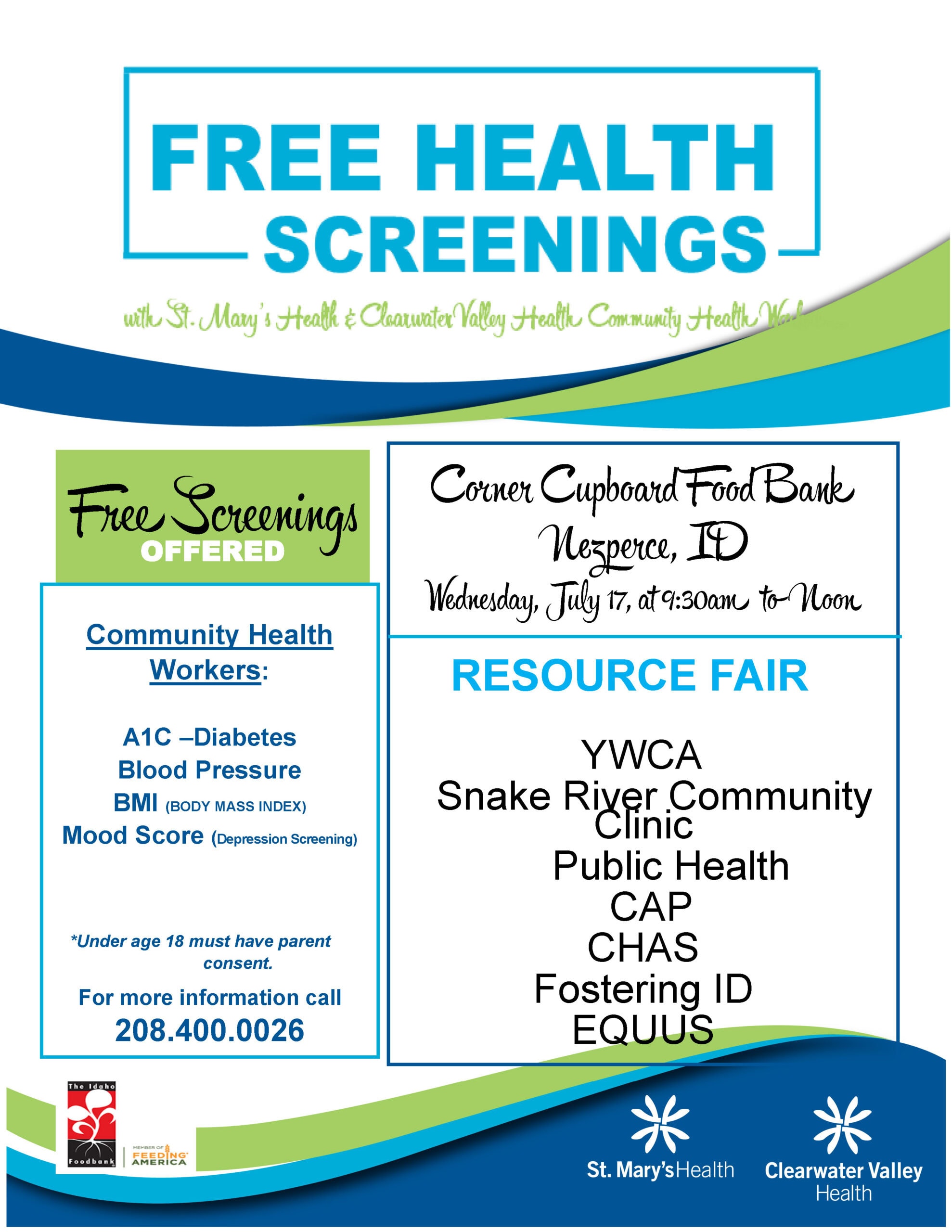Free Health Screening at the Corner Cupboard Food Bank in Nezperce Idaho! Screenings Offered:A1C-DiabetesBlood PressureBMIFIT TestMood Score under 18 must have a parent consent.