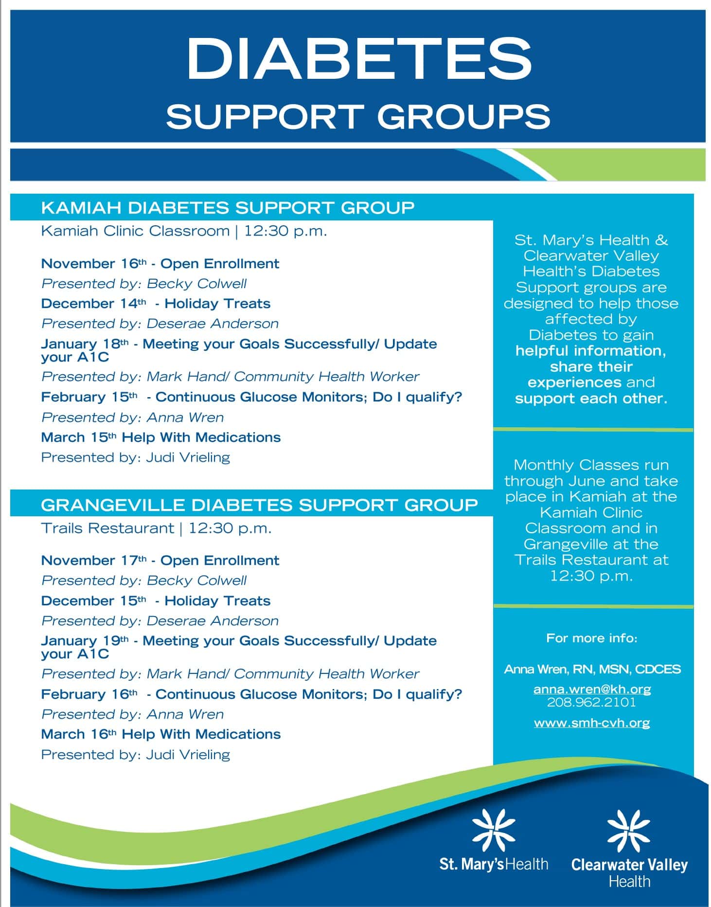 This events specific topic is "Continuous Glucose Monitors; Do I qualify" by Anna Wren. St. Mary's Health and Clearwater Valley Health's Diabetes Support Groups are designed to help those affected by Diabetes to gain helpful information, share their experiences and support each other.