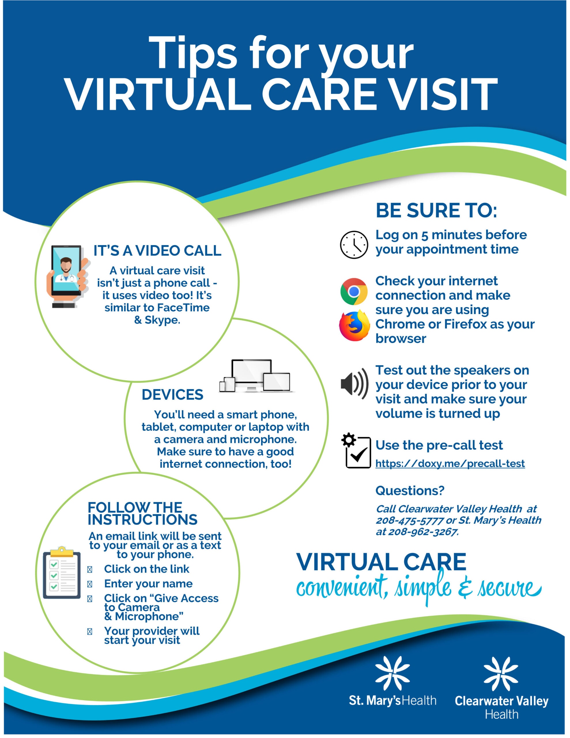 To schedule a Virtual Care visit please call Clearwater Valley Health at 208-476-5777 or St. Mary’s Health at 208-962-3267. The schedulers will be able to give you the next available Virtual Care appointment date and time.